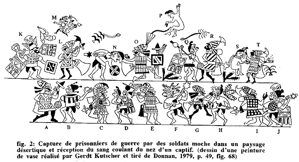 D'autres scènes suggèrent la destination finale de ces combattants capturés devenus prisonniers de guerre, à savoir le centre cérémoniel. On les voit se faire conduire avec la corde autour du cou à travers le désert, selon un itinéraire qui pouvait parfois durer plus d'une journée avant qu'ils ne parviennent à un centre cérémoniel; dans certains cas, il semble qu'on les gardait captifs dans des enclos temporaires, avant de reprendre la route (voir, par exemple, Kutscher, 1983, fig. 116a et 116b). Arrivant nus et ligotés au centre cérémoniel, conservés dans un état de soumission qui devait servir à les dévaloriser aux yeux des vainqueurs, ils étaient alors pris en charge par des hommes, vêtus non pas d'un costume guerrier, mais de vêtements appropriés qui siéent mieux à des experts rituels (voir Lehmann, 1938, p. 275, fig. 474), et par des femmes en tunique sombre (voir Donnan, 1979, p. 35, fig. 5), probablement aussi des membres du clergé religieux moche.