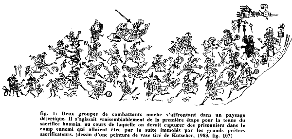 L'étape préparatoire en vue d'une forme privilégiée de sacrifice humain, qui se tenait en contexte guerrier, est sans doute celle qui est la moins bien documentée d'un point de vue archéologique. L'interprétation des activités qui s'y rapportent repose donc presqu'essentiellement sur les documents iconographiques. L'analyse détaillée de certains documents explicites m'a permis de reconstituer ce qui paraît avoir été le «scénario classique» pour ce sacrifice humain particulier. Selon ce scénario, il apparaît que les Moche, à l'instar des Aztèques (voir par exemple Anawalt, 1986; Duverger, 1979), pratiquaient une forme institutionnalisée de combat rituel destinée à fournir à la société des sujets masculins à immoler. Mais contrairement aux Aztèques, les troupes armées moche ne partaient pas en quête de sujets à sacrifier en s'attaquant uniquement aux hordes guerrières issues de contrées voisines, c'est-à-dire de «populations étrangères». Il appert en effet que des royaumes moche, occupant deux vallées voisines ou deux régions limitrophes le long du littoral, autrement dit des communautés-soeurs partageant la même culture, pouvaient périodiquement se faire la guerre à des fins sacrificielles.