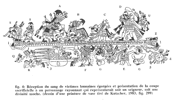 Une fois récupéré dans un bol, le sang sacré subissait une nouvelle manipulation. Toujours maintenu à l'état liquide par le fruit d'ulluchu, il était alors transféré dans une coupe, et peut-être attendait-on d'en avoir une quantité suffisante - après avoir recueilli le sang de plusieurs sacrifiés - avant de passer la coupe sacrificielle à des grands prêtres et prêtresses du sacrifice, les personnages désignés ici par les lettres B et C dans le registre supérieur. Selon mon interprétation, ce sont ces derniers qui, selon une «division du travail ritualisée» basée sur les différences hommes-femmes (voir Arsenault, n.d.), se chargeaient ensuite de présenter l'oblation soit à une entité surnaturelle masculine - divinité ou ancêtre -, soit à un grand-prêtre affublé des attributs de cette entité - le personnage A dans la présente scène. C'est cet acte d'offrande de la coupe sacrificielle qui paraît avoir été le point culminant, ou acmè, du sacrifice humain pratiqué dans les centres cérémoniels moche.
