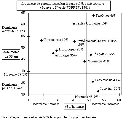On voit d'abord que 9 croyances sur 11 sont surreprésentées chez les jeunes (moins de 35 ans), confirmant ainsi les analyses proposées plus haut. Seules les croyances à la radiesthésie et surtout aux sourciers sont plus intenses chez les personnes plus âgées, ce qui correspond à leur enracinement dans l'ensemble de la population et plus particulièrement chez les paysans, dont la moyenne d'âge est élevée. Contrairement à des préjugés tenaces, les croyances au paranormal ne sont pas systématiquement plus fréquentes chez les femmes que chez les hommes. On observe une différenciation entre des croyances nettement féminines, qui concernent essentiellement la divination (cartomancie, astrologie, horoscopes), et des croyances plutôt masculines, en particulier la croyance aux OVNI, si imprégnée de mythologie technico-scientifique.