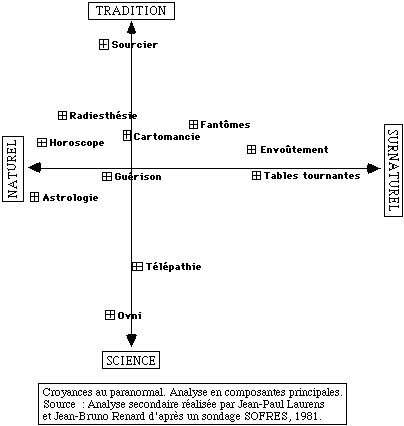 Ce tableau permet de visualiser les motivations opposées qui soutiennent telle ou telle croyance au paranormal. Du côté de la tradition, on trouve les pratiques rurales (sourcier, radiesthésie) et le folklore ancien (fantômes), tous étroitement associés à un savoir empirique, à la terre et au terroir. Au contraire les OVNI, la télépathie, l'astrologie même, prétendent s'appuyer sur un savoir scientifique et évoquent plutôt les relations avec le ciel (extraterrestres, ondes aériennes, astres). Le second axe permet de distinguer d'une part des pratiques mettant en oeuvre des dons cachés de l'homme (divination, radiesthésie, guérisseurs), mais naturels, et d'autre part des pratiques et des croyances surnaturelles, en liaison avec l'Au-delà, l'occulte, les entités fantastiques (fantômes, envoûtements, tables tournantes). Ainsi, pour reprendre les termes de Jacques Maître, les croyances au paranormal, qui «s'apparentent dans une commune appartenance à cette nébuleuse d'hétérodoxies», sont «si divergentes par ailleurs [13]».