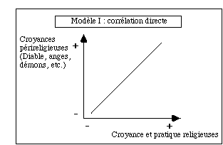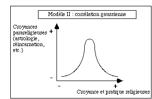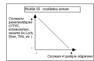 Le troisième modèle de corrélation est l'inverse du premier : il établit une liaison inversement proportionnelle entre des croyances au paranormal qui ont un contenu parascientifique et le niveau d'intégration religieuse.
